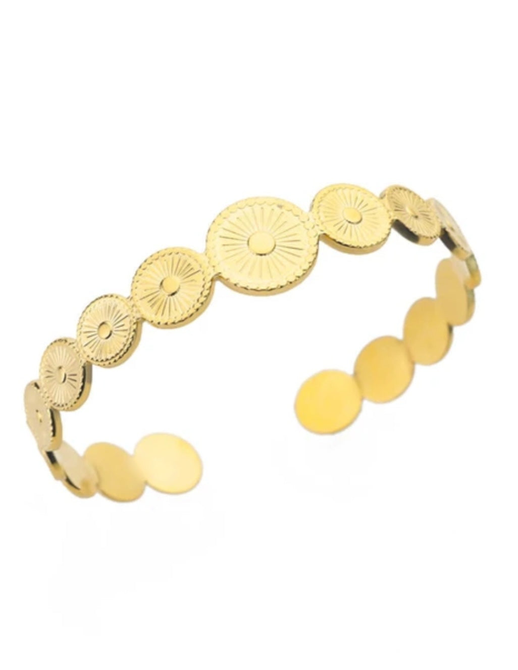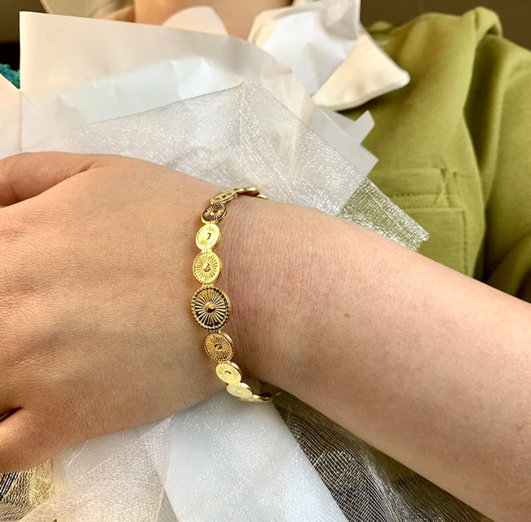 Looking for a timeless and elegant accessory? This vintage bangle is 18K gold plated and tarnish-free, perfect for any occasion. The perfect blend of classic design and modern materials, this bangle adds a touch of sophistication to any outfit. Elevate your style with this versatile piece.